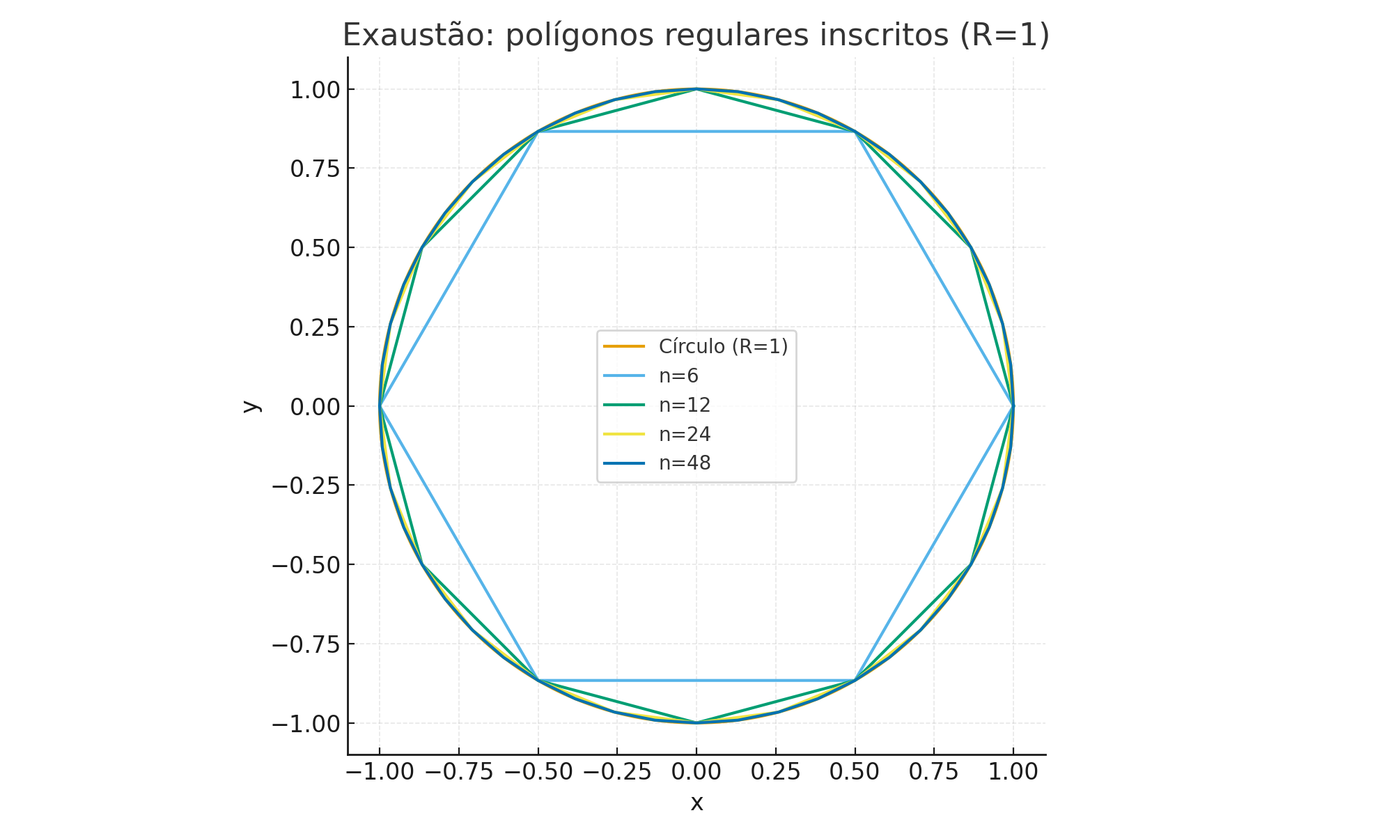 As \(n\) grows, the polygon’s area approaches the area of the circle — this is Archimedes’ method of exhaustion.