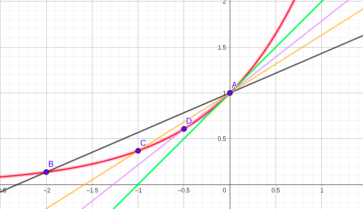 We use the function \(y=e^x\) at the point \(A(0,1)\). In the figure, secant lines \((A–B, A–C, A–D)\) “rotate” until they become the green line, which represents the tangent at \(A\).