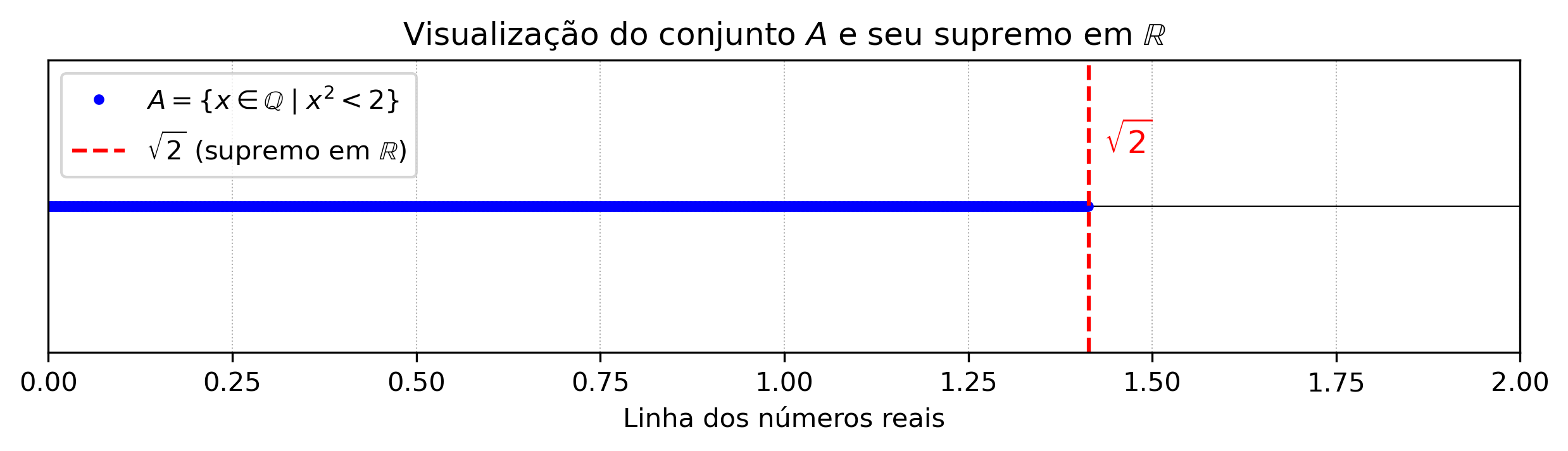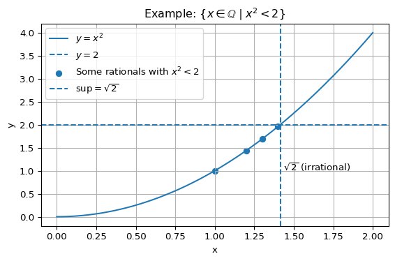 - \(A=\{x\in\mathbb{Q}\mid x^2<2\}\) is bounded above, but has no supremum in \(\mathbb{Q}\) (it would be \(\sqrt{2}\)).