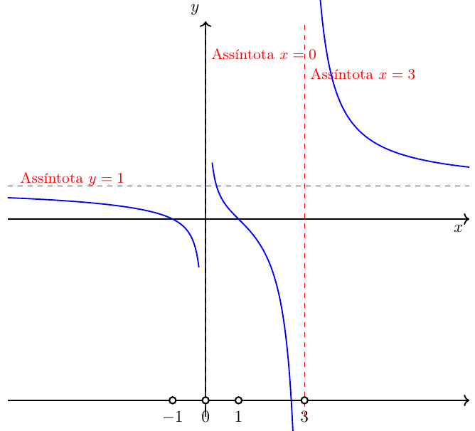 (Criticals \(-1\) [zero] and \(3\) [asymptote]; signs: \(+,-,+\); we want \(+\).)