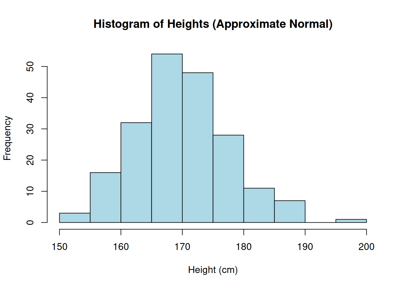 # Generate the sample of heightsset.seed(123)# Ensures reproducibilityheights<-rnorm(200, mean =170, sd =8)# Display the Histogramhist(heights,breaks =15,main ="Histogram of Heights (Approximate Normal)",xlab ="Height (cm)",col ="lightblue",border ="black")