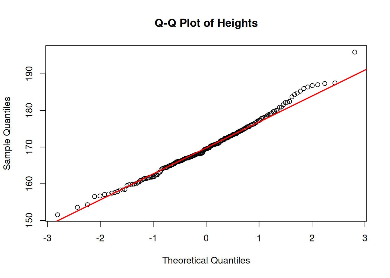 # Display the Q-Q Plotqqnorm(heights,main ="Q-Q Plot of Heights")qqline(heights, col ="red", lwd =2)