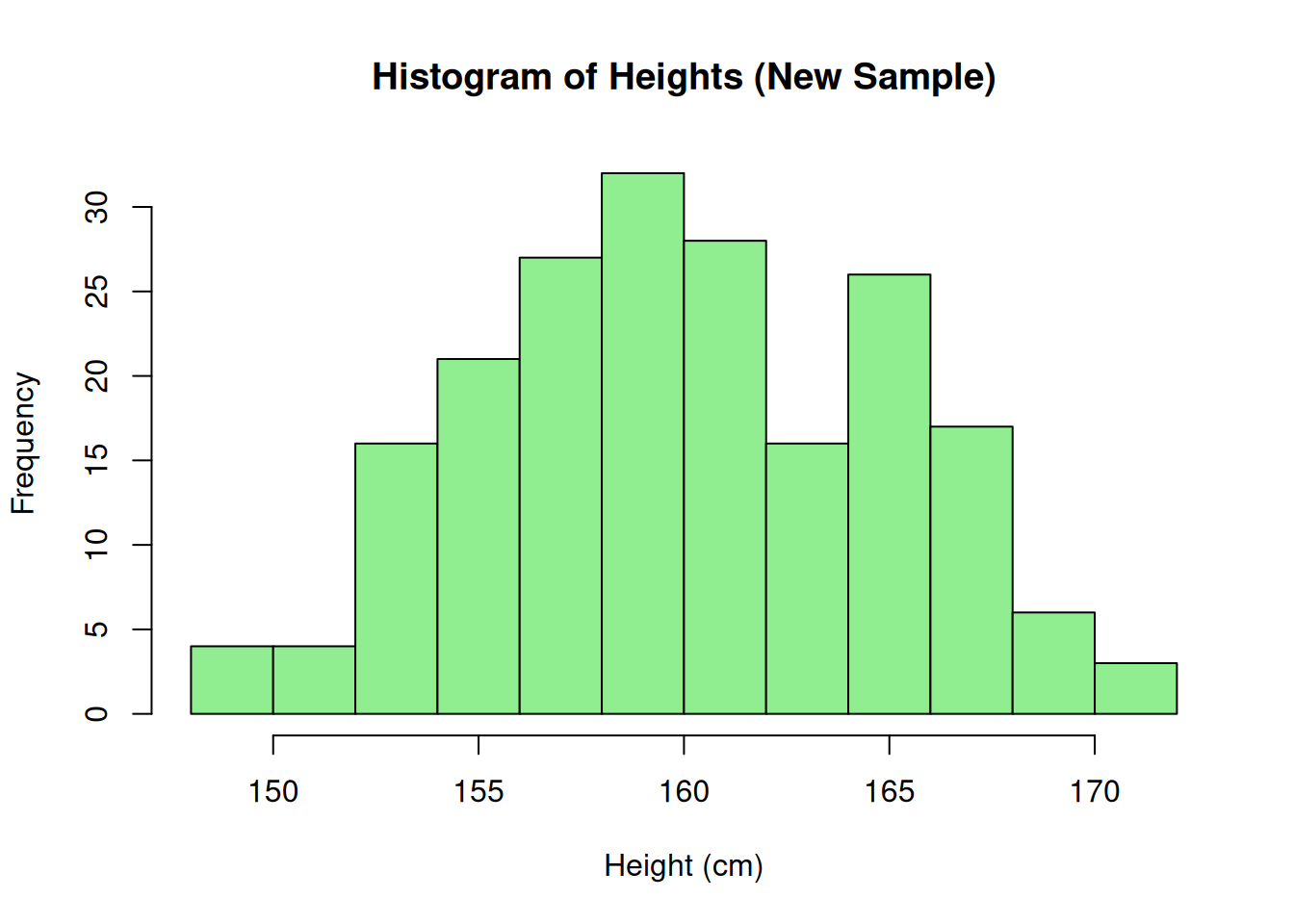 # Generate new sampleset.seed(456)# New seed to vary the datanew_heights<-rnorm(200, mean =160, sd =5)# Histogramhist(new_heights,breaks =15,main ="Histogram of Heights (New Sample)",xlab ="Height (cm)",col ="lightgreen",border ="black")