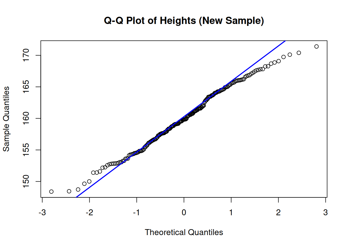 # Q-Q Plotqqnorm(new_heights,main ="Q-Q Plot of Heights (New Sample)")qqline(new_heights, col ="blue", lwd =2)